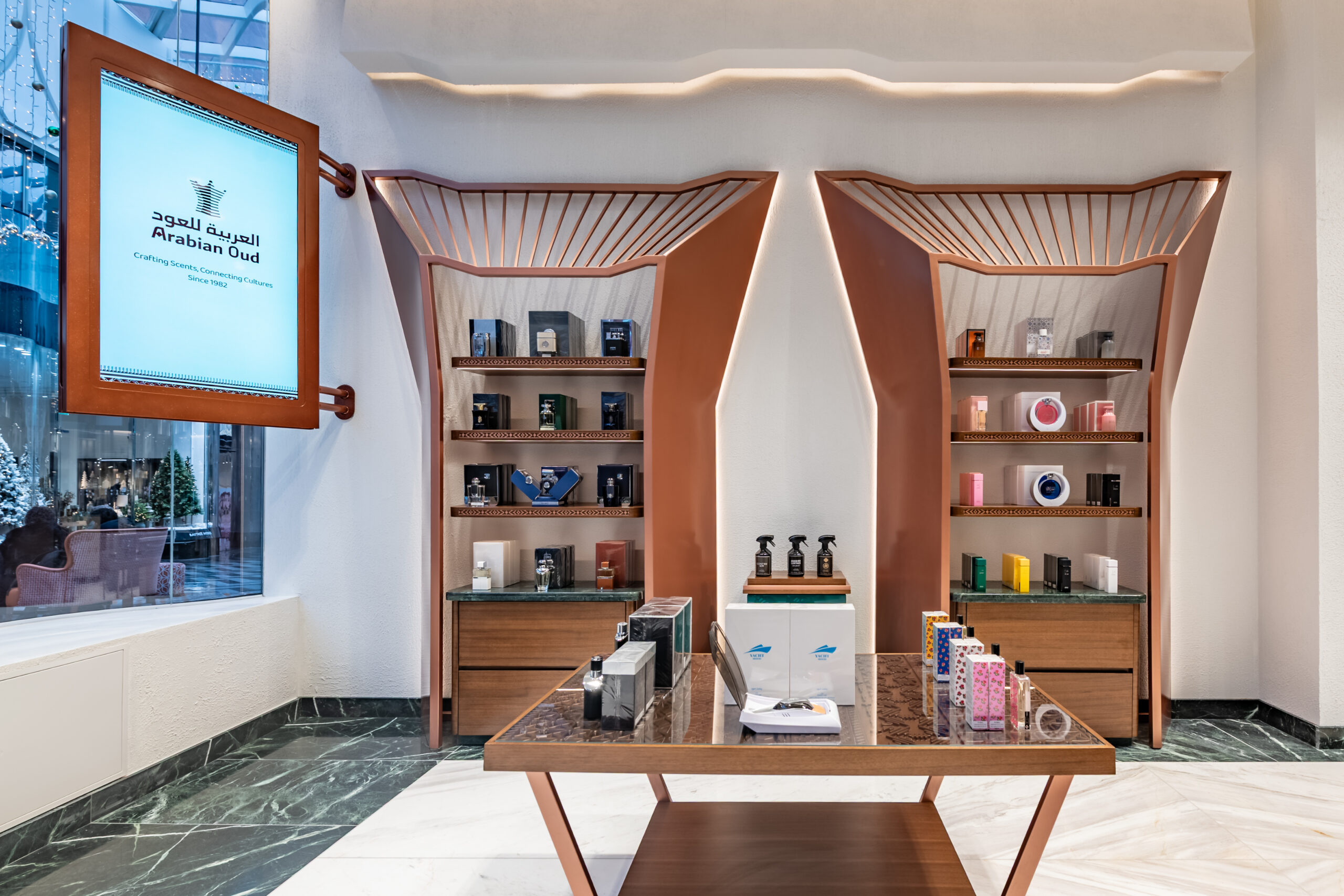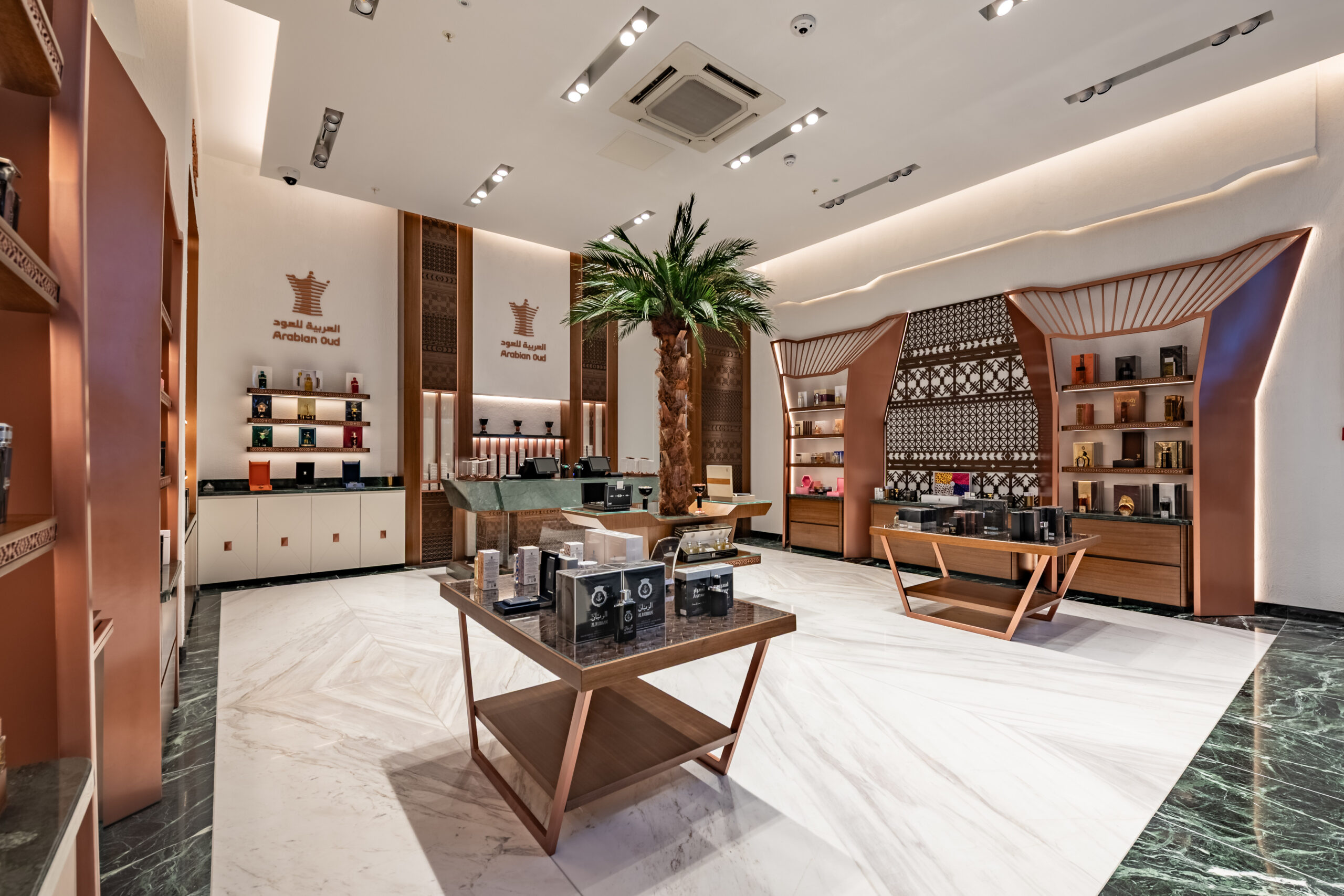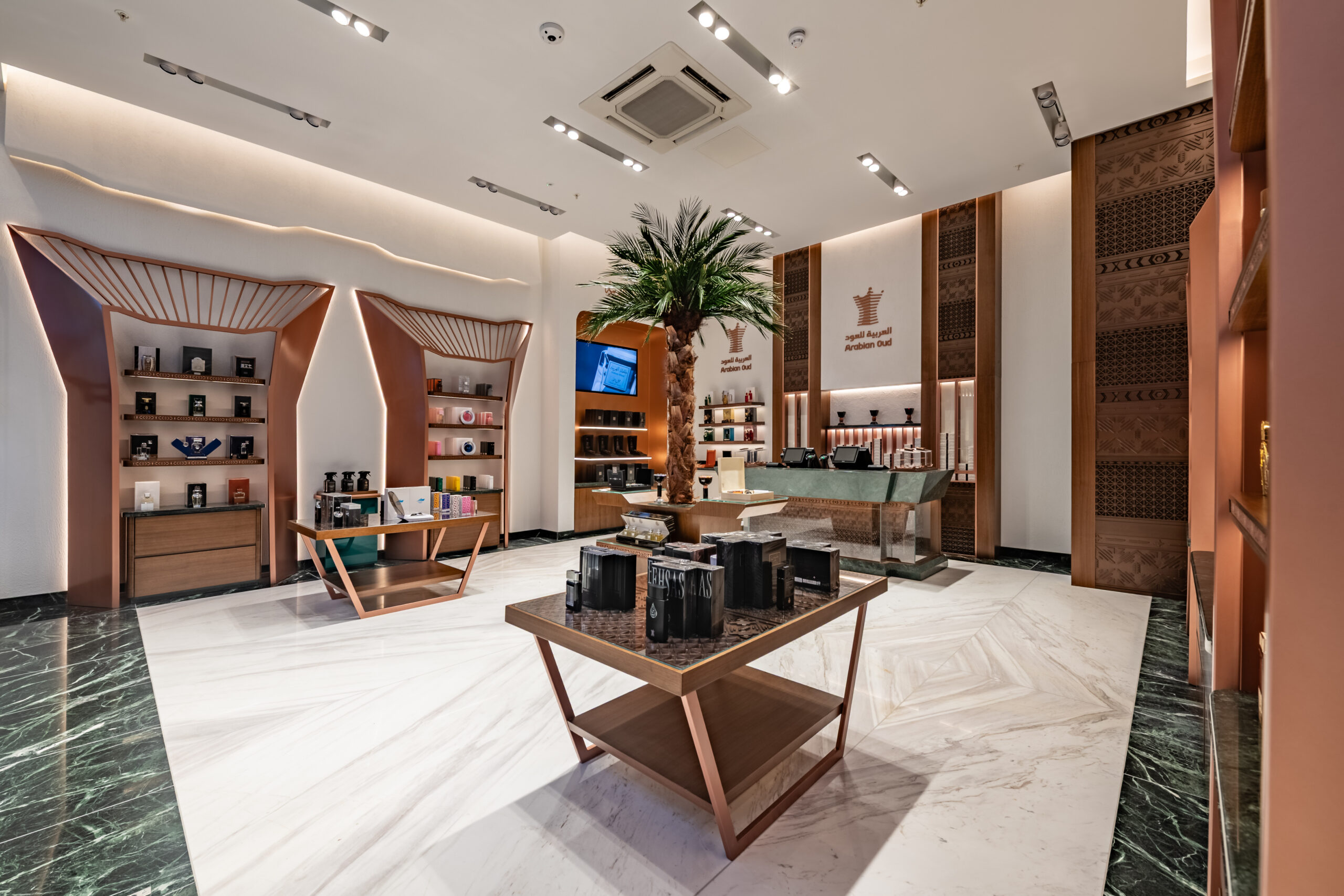 This project involved a full retail refurbishment and shop fit for luxury fragrance brand Arabian Oud, transforming the space into an elegant retail environment within the high-end Victoria Gate shopping centre in Leeds.