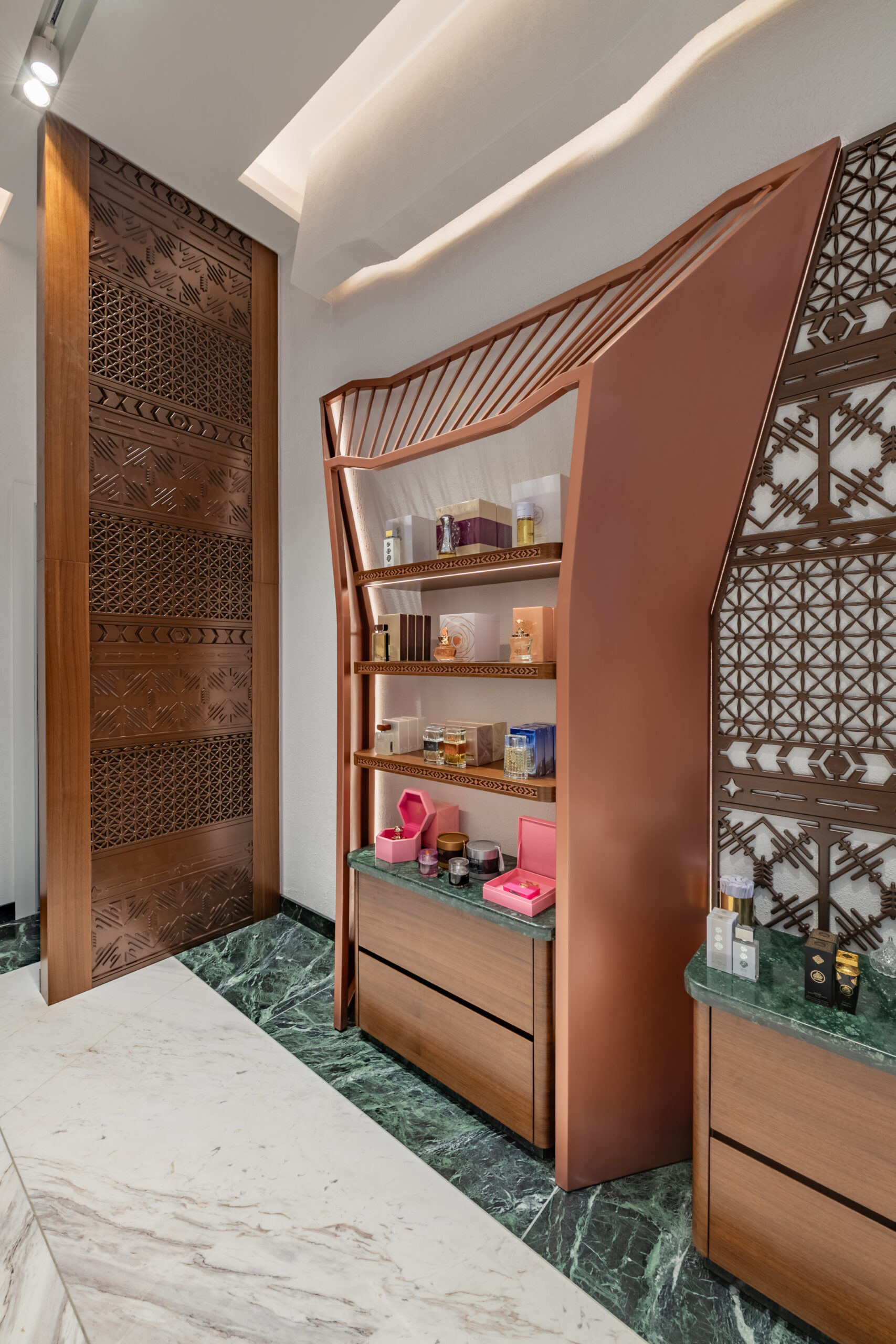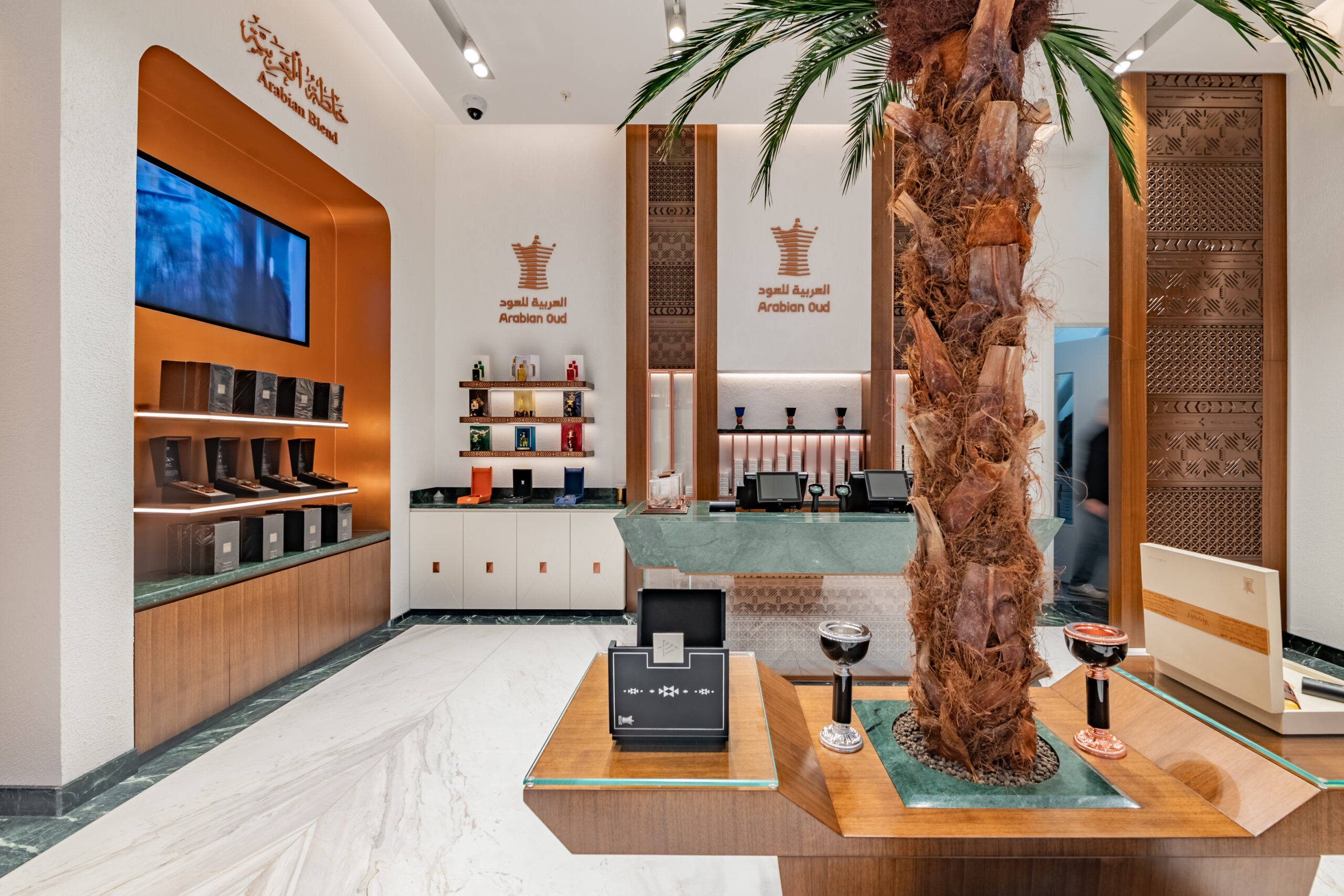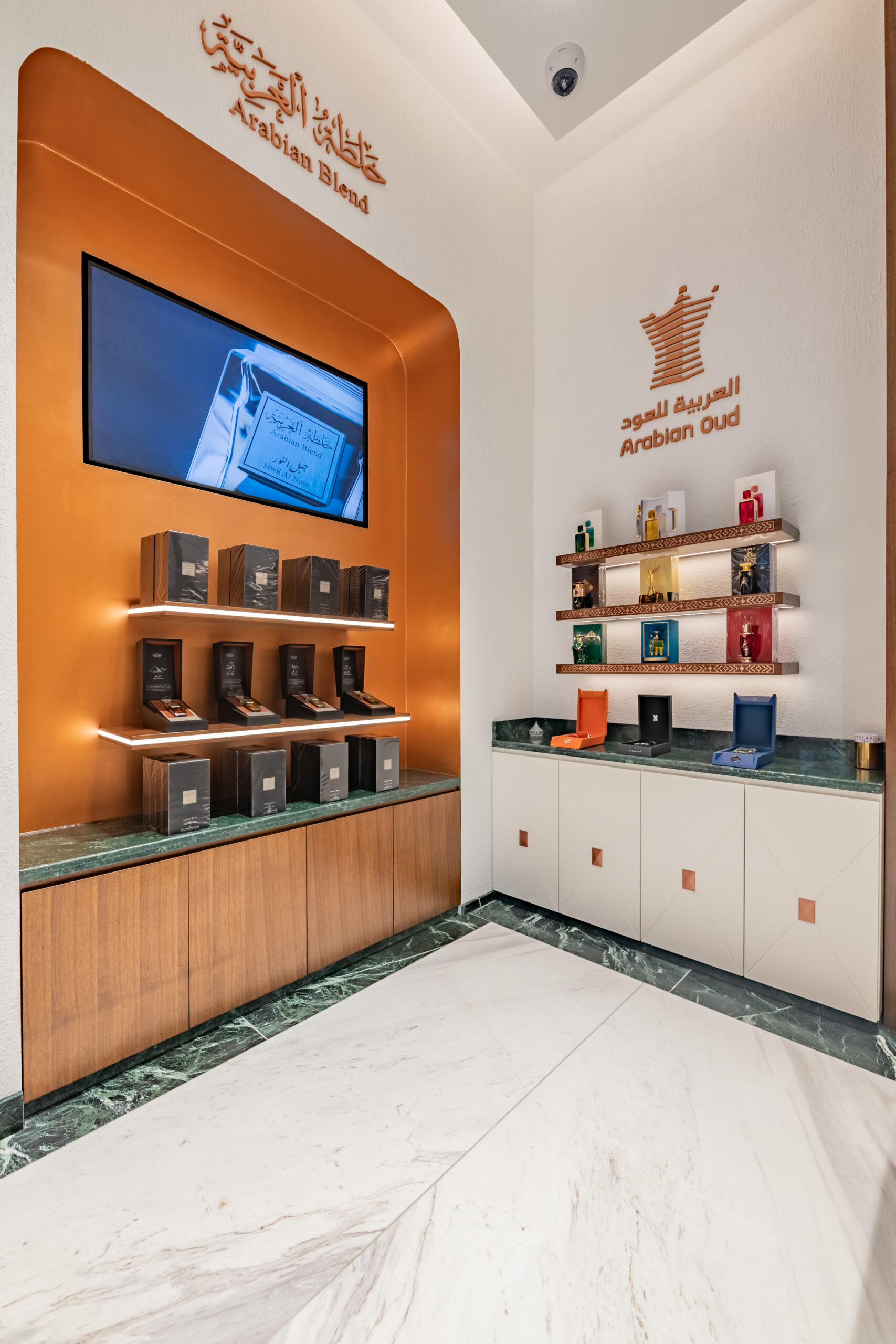 This project involved a full retail refurbishment and shop fit for luxury fragrance brand Arabian Oud, transforming the space into an elegant retail environment within the high-end Victoria Gate shopping centre in Leeds.